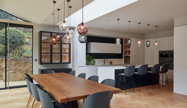 At Rothschild & Bickers we offer a huge range of customisable lighting, designed for residential interiors. Whether you're selecting a single pendant or planning a coordinated scheme throughout, our collection allows you to tailor details such as glass colour, metal finish, flex, and ceiling fixing to suit your space. Each piece is individually hand-blown in our UK workshop, combining traditional craftsmanship with modern design flexibility. We offer guidance on sizing, placement, and installation to help you create lighting that is both functional and beautifully bespoke—bringing a sense of individuality and luxury to any room.