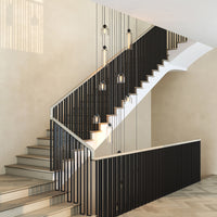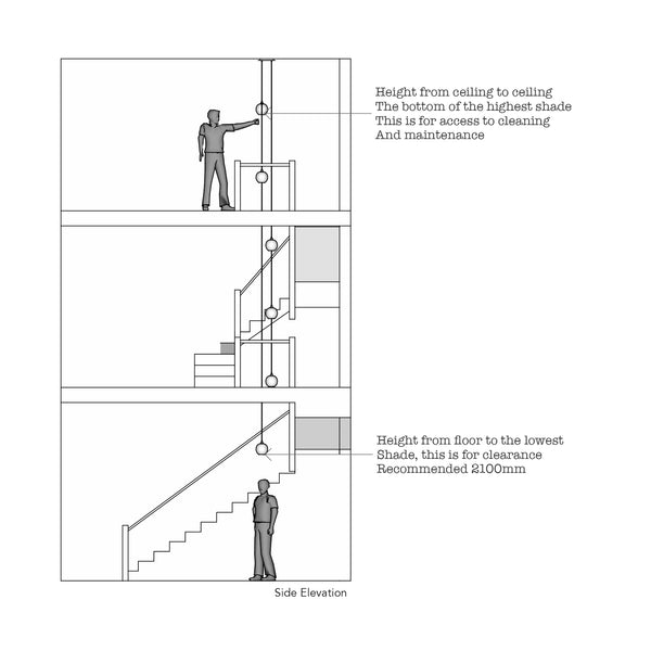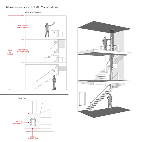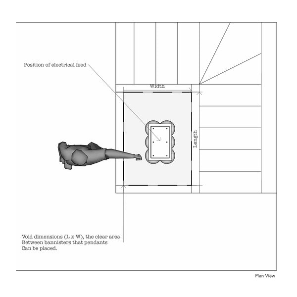 Please measure the open space between your staircases where the pendants will hang. This helps us determine the appropriate drop lengths and overall scale of the design.