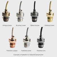 All UL Products are made with Bakelite UL listed E12 (UK/EU E14 equivalent) and E26 (UK/EU E27 equivalent) lamp holder fittings to replace our UK/EU metal components. These have been powder coated to match our full range of finishes. Please note that the Spindle Pendant Collection has an added socket cover due to the design, this conceals the bakelite threaded skirt.