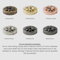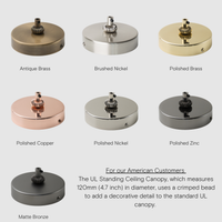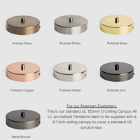 All UL Pendants are supplied with a 4.7 inch (120mm) ceiling canopy you have a choice of 3 different styles. This is mounted with a 4.56 inch back strap and 2 x side fix grub screws, all technical specifications can be found on our accessories page.
