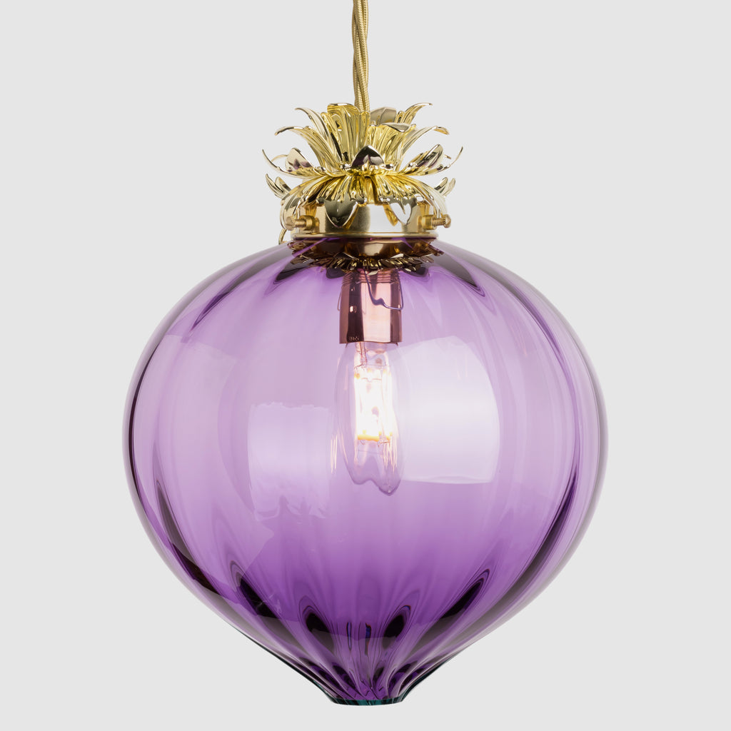 These pendants are inspired by the botanical designs found in Art & Crafts lighting. The shade is made from ribbed optical glass and attached to a decorative pressed metal floral holder.