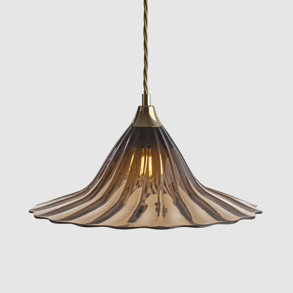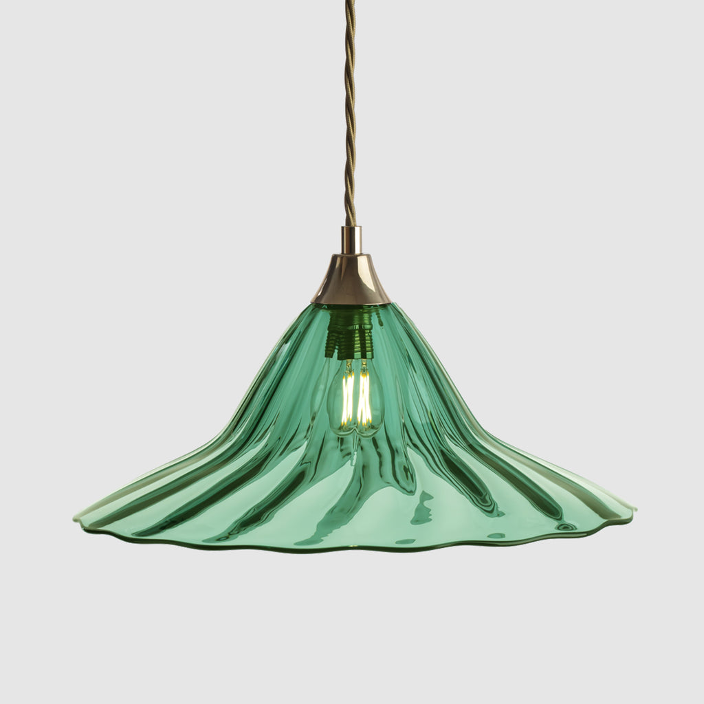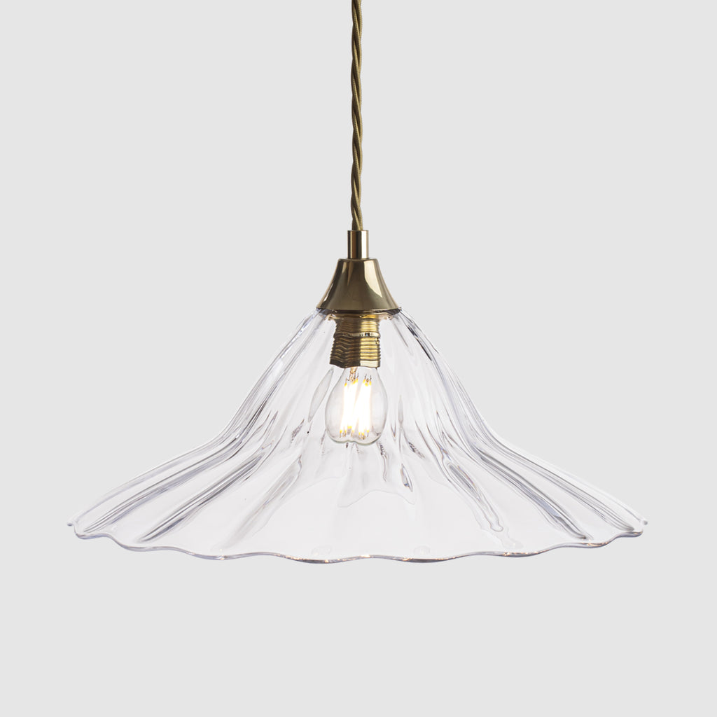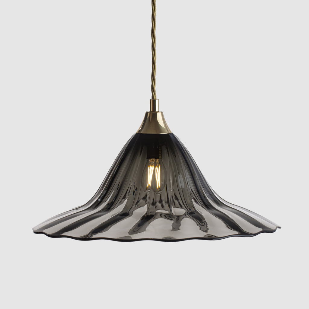 These suspension pendants are made using an optic mould to create a ribbed finish on the glass shade which is then heated up and spun out to form a wide flat form with a scalloped rim.