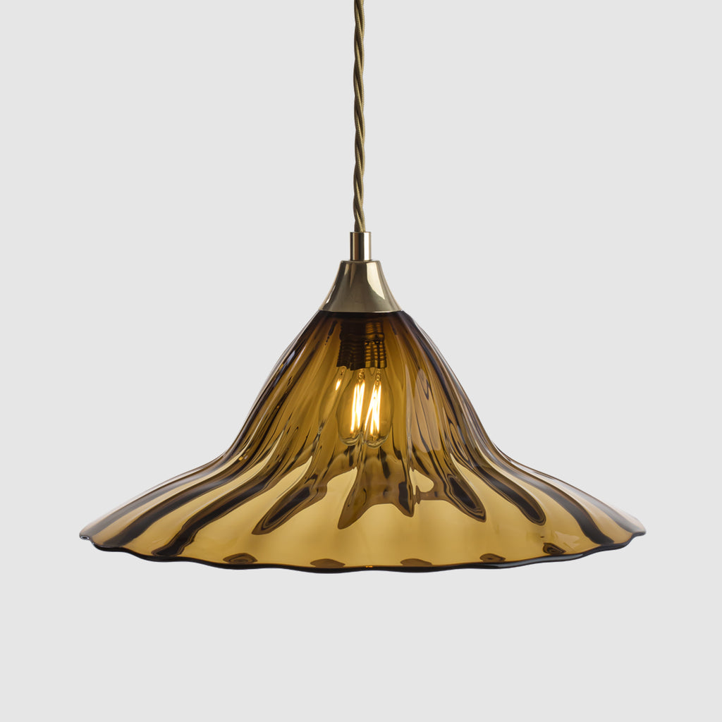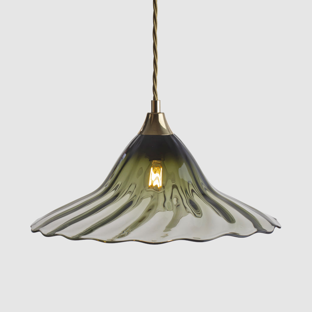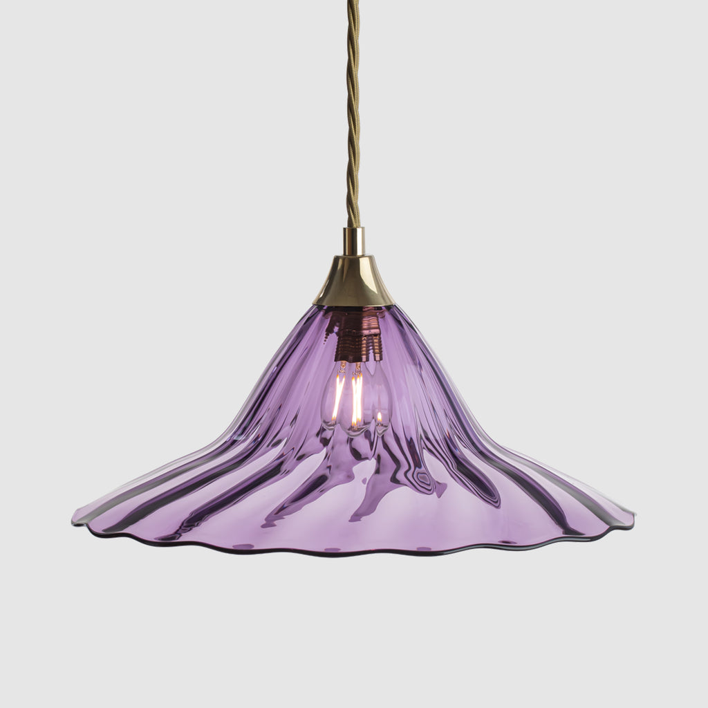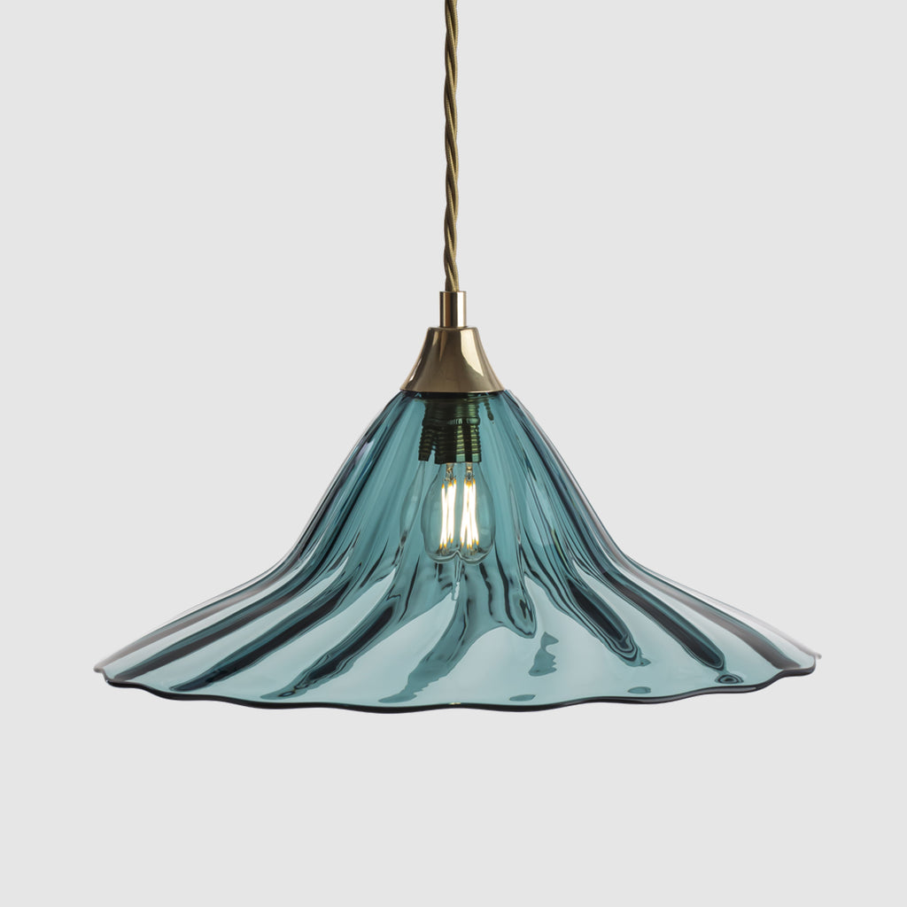 These suspension pendants are made using an optic mould to create a ribbed finish on the glass shade which is then heated up and spun out to form a wide flat form with a scalloped rim.