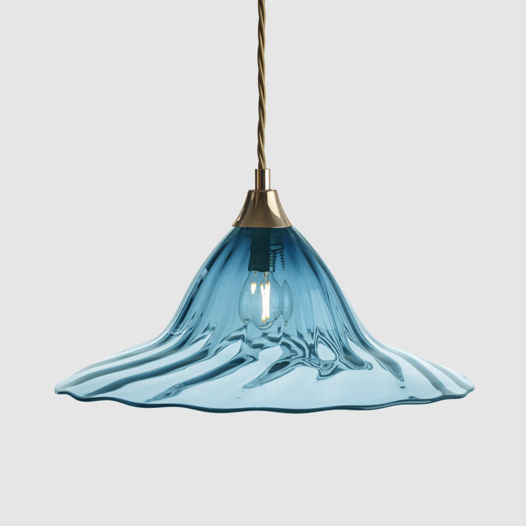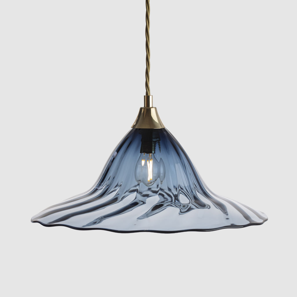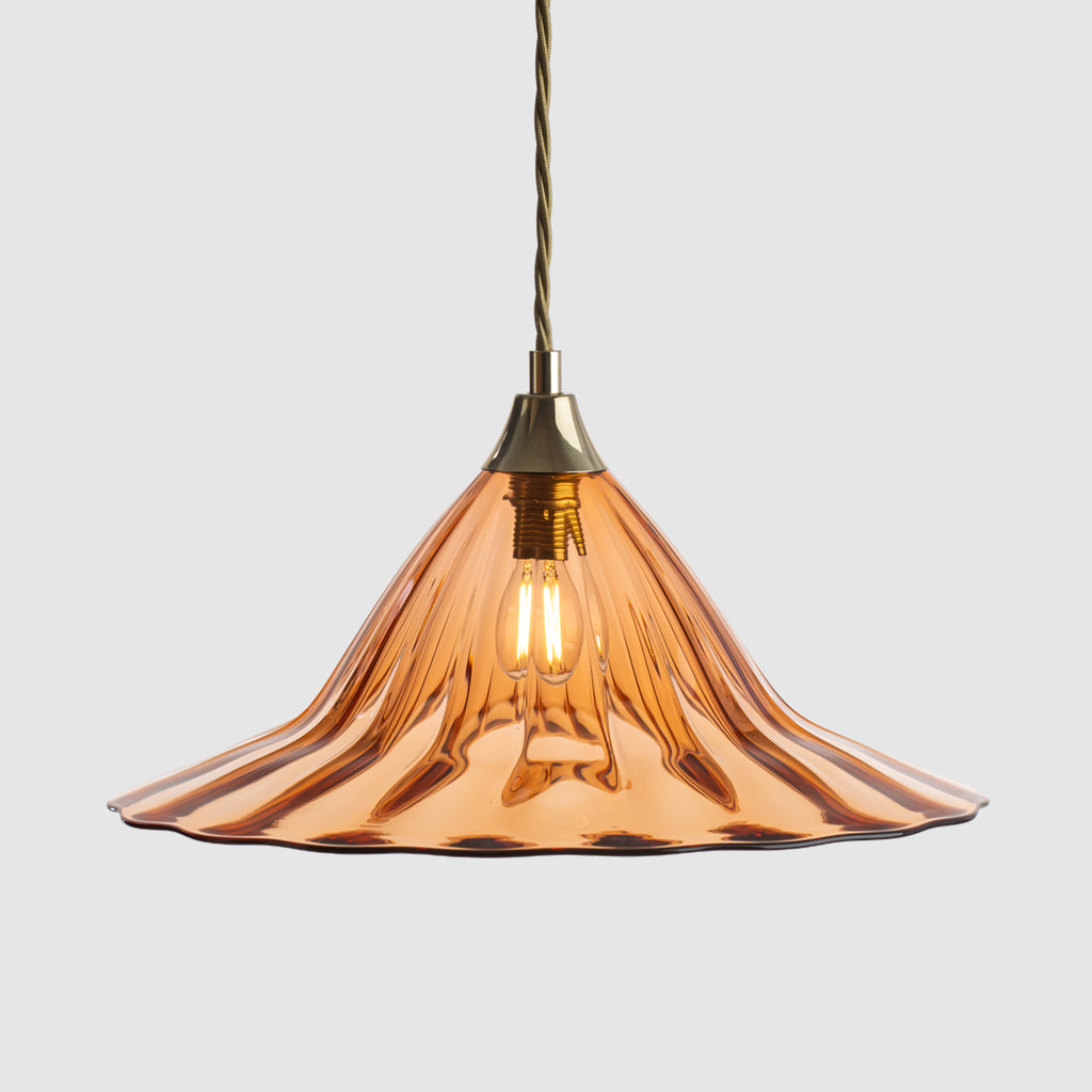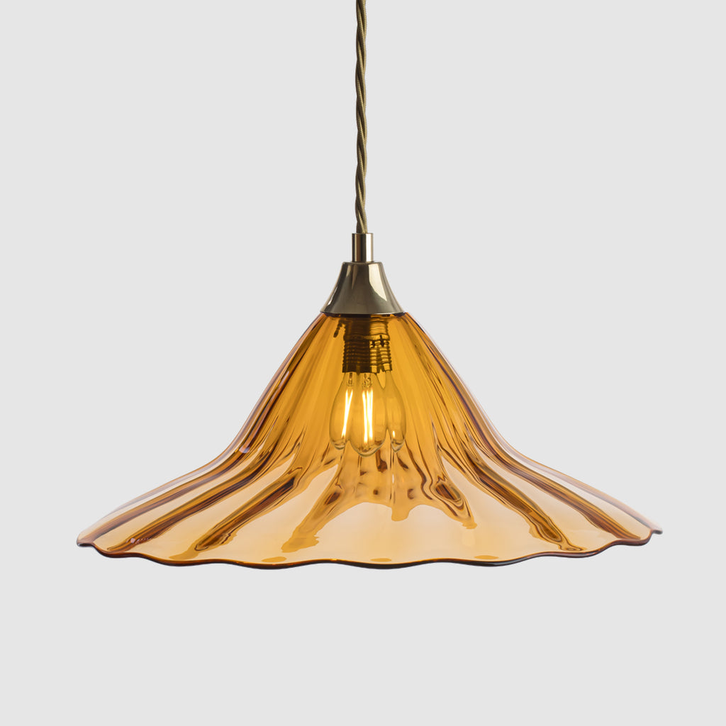 These suspension pendants are made using an optic mould to create a ribbed finish on the glass shade which is then heated up and spun out to form a wide flat form with a scalloped rim.