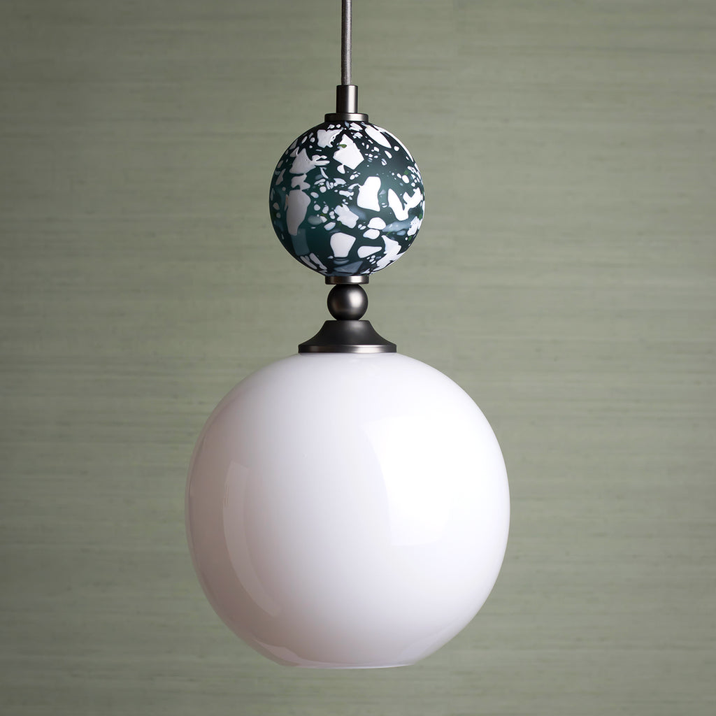 These suspension pendants are a playful collection that combine two simple spheres, mixing our Terrazzo and opaque white glass. Bring your space alive and add some pattern with our selection of finishes. Available in all our metal finishes. Lead time 6-8 weeks. As standard, this item comes with a 1.5M flex length and an E14 Golfball bulb. (No bulb supplied for USA/Canada)