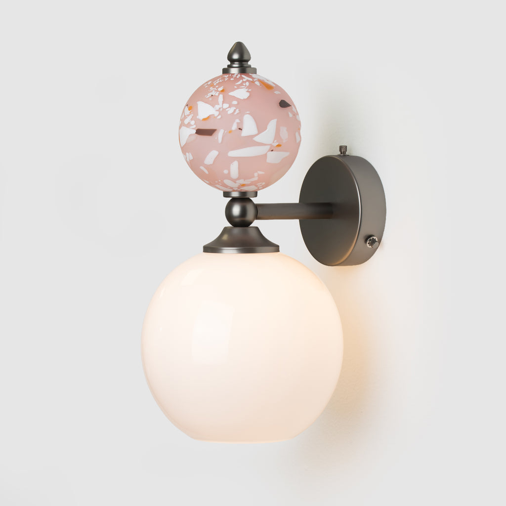 These wall sconces are a playful design that combines two simple spheres, mixing our Terrazzo and opaque white glass. Bring your space alive and add some pattern with our selection of finishes. Available in all our metal finishes. Lead time 6-8 weeks. As standard, this item comes an E14 golfball bulb. (No bulb supplied for USA/Canada and a larger backplate is used).
